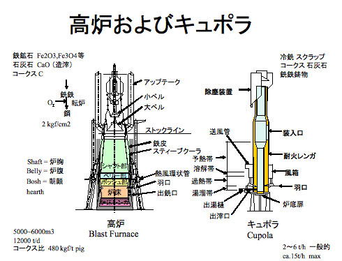 高炉は鉄鉱石から脈石を取り除き、溶けた銑鉄を取り出す装置で、背が高いので高炉と呼ばれる。現在では高さ100m、直径が15mに及ぶものがある。